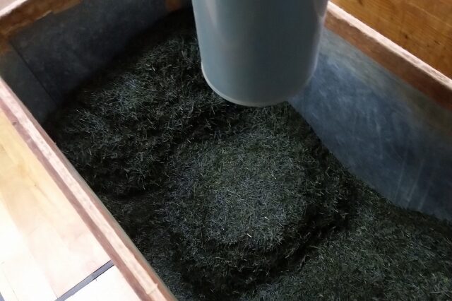 荒茶は形状が不均一でやや水分が多いため、火入れをして乾燥させ、粉や茎を取り除いたりなどして整えていきます。