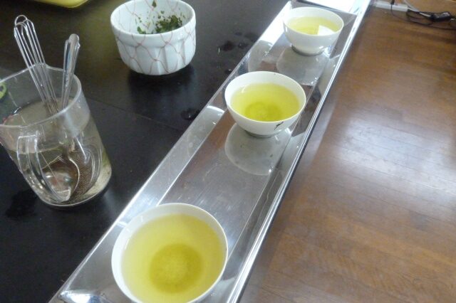 次に、茶殻を取り除き、浸出した液(茶)の味を審査匙で味わいます。浸出液の色、透明感、オリの様子なども観察します。